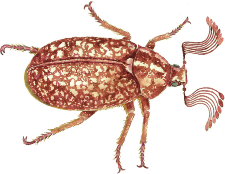 那么这位古博物学家所说的缩绒金龟子是什么呢?我并不很清楚。在描述这种东西时还说身上带有白点,这与松树鳃角金龟的特征相符,后者也带有白点,但这并不足以说明这就是松树鳃角金龟。普林尼自己似乎也没有十分确定其最好的这种药物究竟是何物。在他那个时代,肉眼还不会观察这种昆虫,因为它太小,只是孩子们的玩物,他们用一根长线拴住它,抡圆了甩着玩,有教养的大人对它是不屑一顾的。