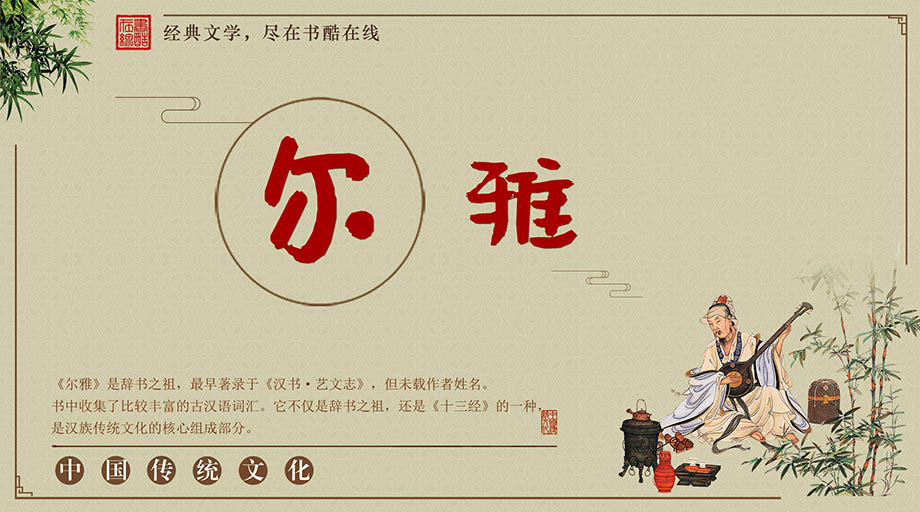 《尔雅》是辞书之祖,最早著录于《汉书·艺文志》,但未载作者姓名。书中收集了比较丰富的古汉语词汇。它不仅是辞书之祖,还是《十三经》的一种,是汉族传统文化的核心组成部分。“尔”是“近”的意思(后来写作“迩”),“雅”是“正”的意思,在这里专指“雅言”,即在语音、词汇和语法等方面都合乎规范的标准语。《尔雅》的意思是接近、符合雅言,即以雅正之言解释古汉语词、方言词,使之近于规范。