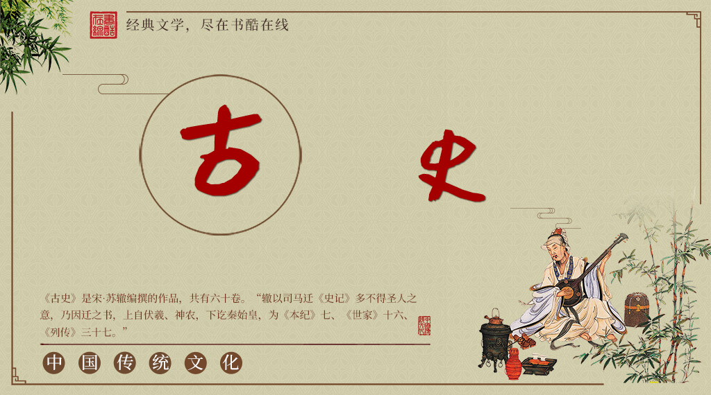 《古史》是宋·苏辙编撰的作品,共有六十卷。“辙以司马迁《史记》多不得圣人之意,乃因迁之书,上自伏羲、神农,下讫秦始皇,为《本纪》七、《世家》十六、《列传》三十七。”
