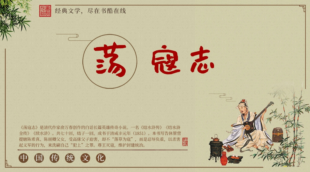 《荡寇志》是清代作家俞万春创作的白话长篇英雄传奇小说。一名《结水浒传》《结水浒全传》。又名《续水浒》。七十回,结子一回。题“山阴忽来道人俞万春仲华甫手著”。成书于清咸丰元年(1851)。