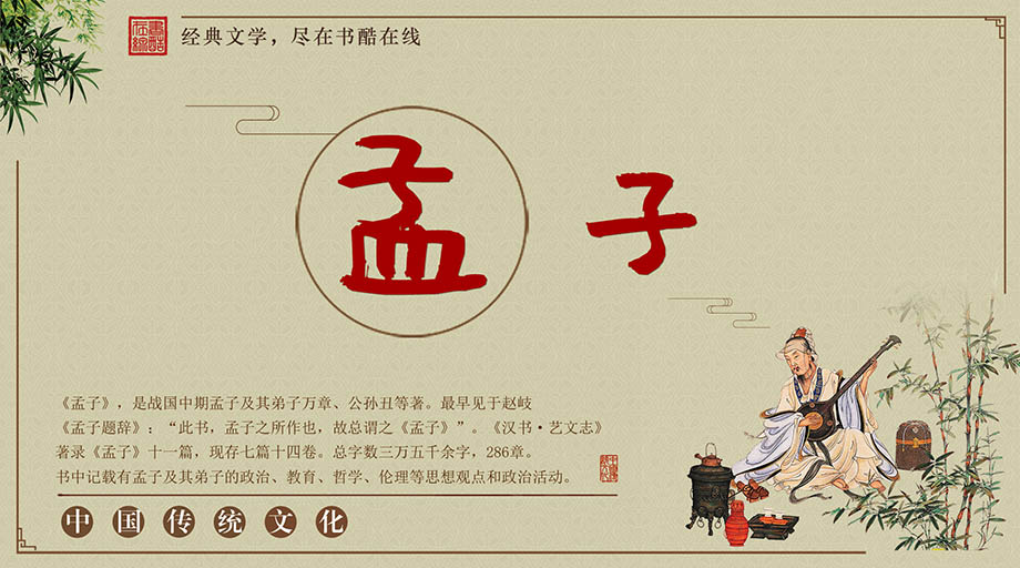 《孟子》,是战国中期孟子及其弟子万章、公孙丑等著。最早见于赵岐《孟子题辞》:“此书,孟子之所作也,故总谓之《孟子》”。《汉书·艺文志》著录《孟子》十一篇,现存七篇十四卷。总字数约三万五千字,286章。相传另有《孟子外书》四篇,已佚(今本《孟子外书》系明姚士粦伪作)。书中记载有孟子及其弟子的政治、教育、哲学、伦理等思想观点和政治活动。